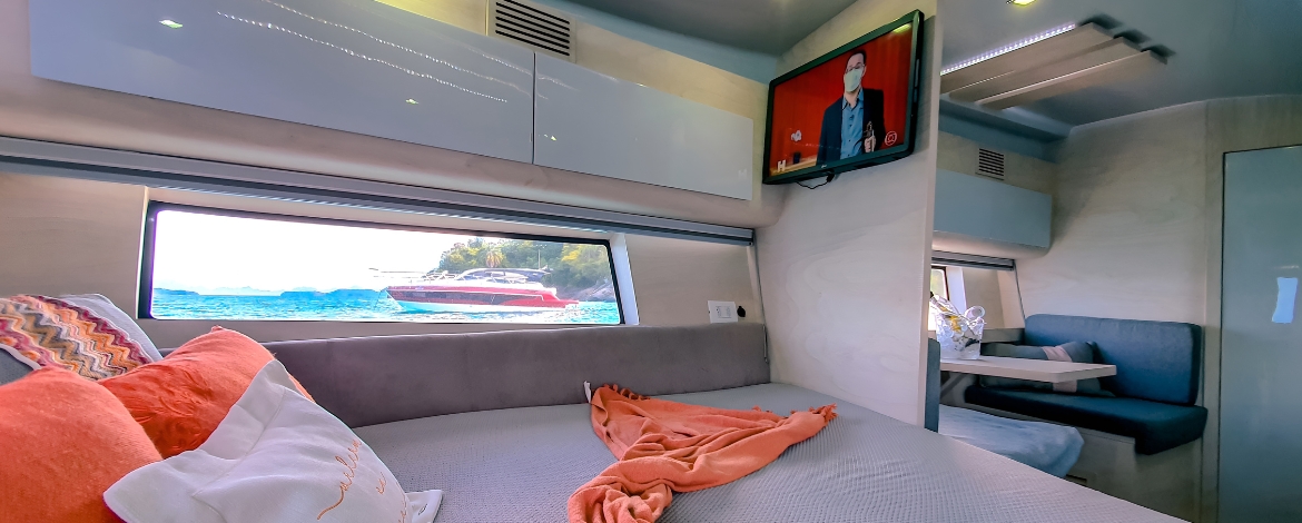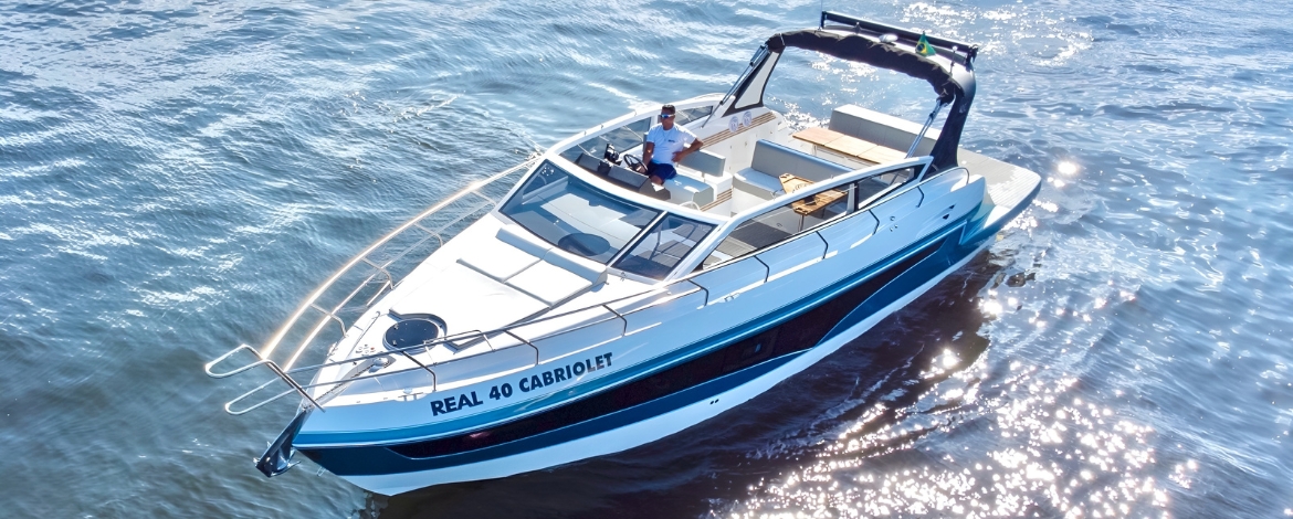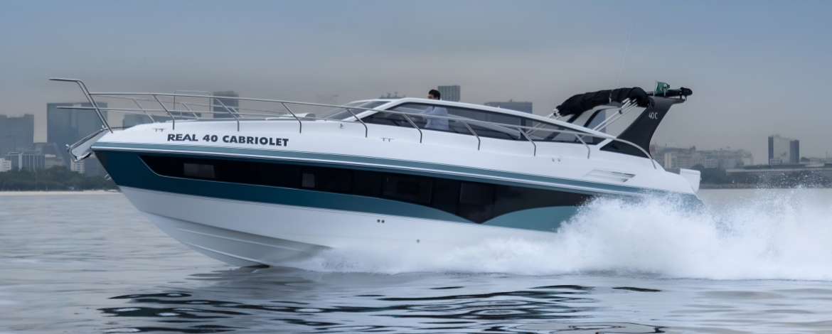 A Real 40 Cabriolet une o design Esportivo à sofisticação, aspecto que se destaca na linha Luxury. Apresenta o maior cockpit da categoria, contendo acesso à proa por uma confortável escada posicionada na parte interna da embarcação, que proporciona maior segurança e comodidade a bordo. Com a Cabriolet você vai experimentar a liberdade ao pilotar uma embarcação open, com a sensação de uma embarcação fly, isso devido a possibilidade de pilotar sentado, com ampla e perfeita visão do exterior. Uma verdadeira satisfação para os apreciadores de uma navegação perfeita.
