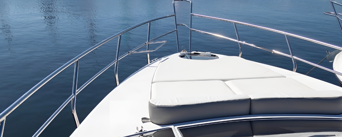 Solário com encosto reclinável para 01 casal, sendo o acesso a proa por dois largos passadiços laterais;