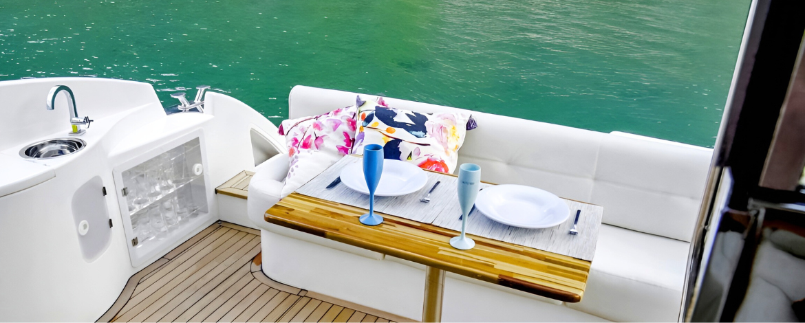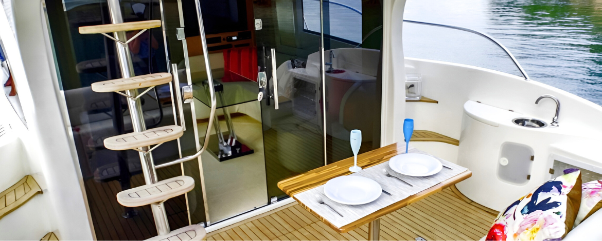A ampla área viabiliza a criação de um ambiente a mais onde pode-se utilizar cadeiras, nela encontramos um espaço gourmet completo. Tem-se ainda dois porta cabos laterais, ducha de popa, caixa para peixes e ainda escada retrátil anatômica (inclinada).