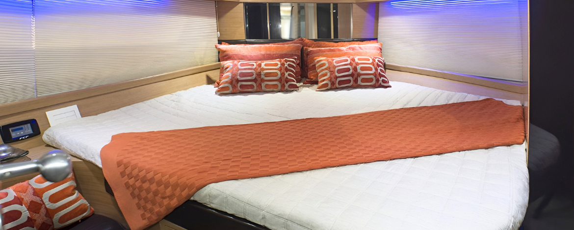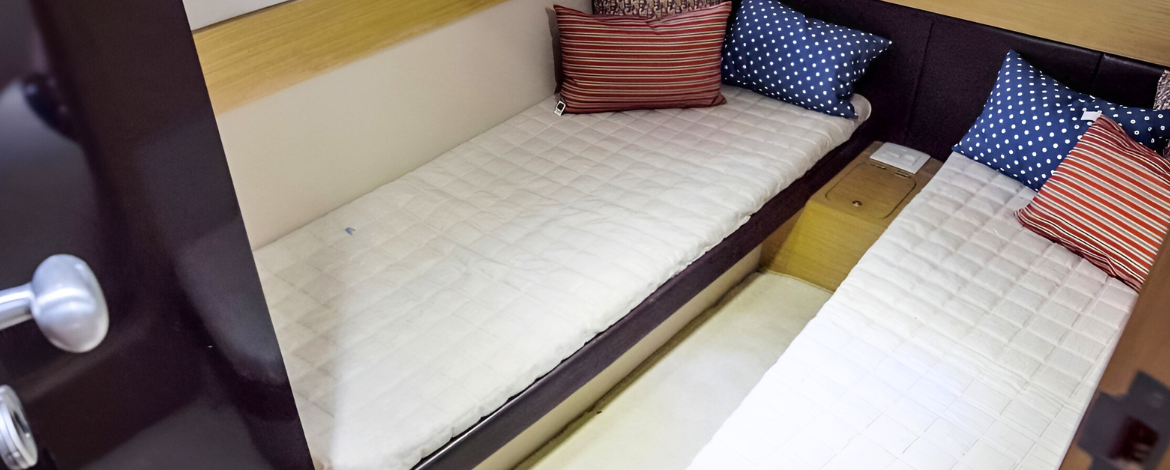 Ampla gaiuta redonda e vigias laterais com cortinas, garantem a iluminação e a ventilação. Cama king-size com porta objetos sob a mesma, posicionada lateralmente, facilita a circulação e o acesso ao guarda-roupa e armários superiores laterais com porta;