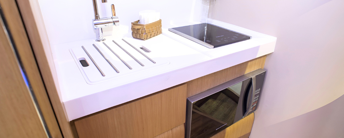 Cozinha completa com balcão, pia, área para corte, água quente e fria, lixeira, geladeira, micro-ondas, fogão elétrico, dispensa e gavetas. Dois sofás que acomodam doze passageiros com Televisor LCD e DVD.